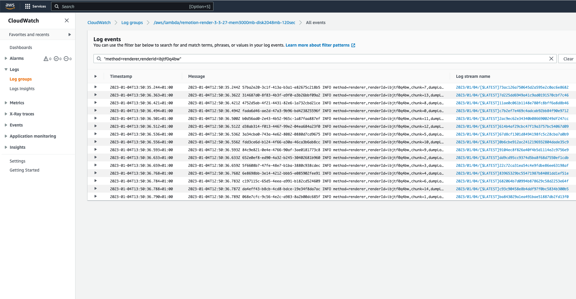 • When using renderMediaOnLambda() add logLevel: "verbose" as an option. You will get a cloudWatchLogs field in the return value.